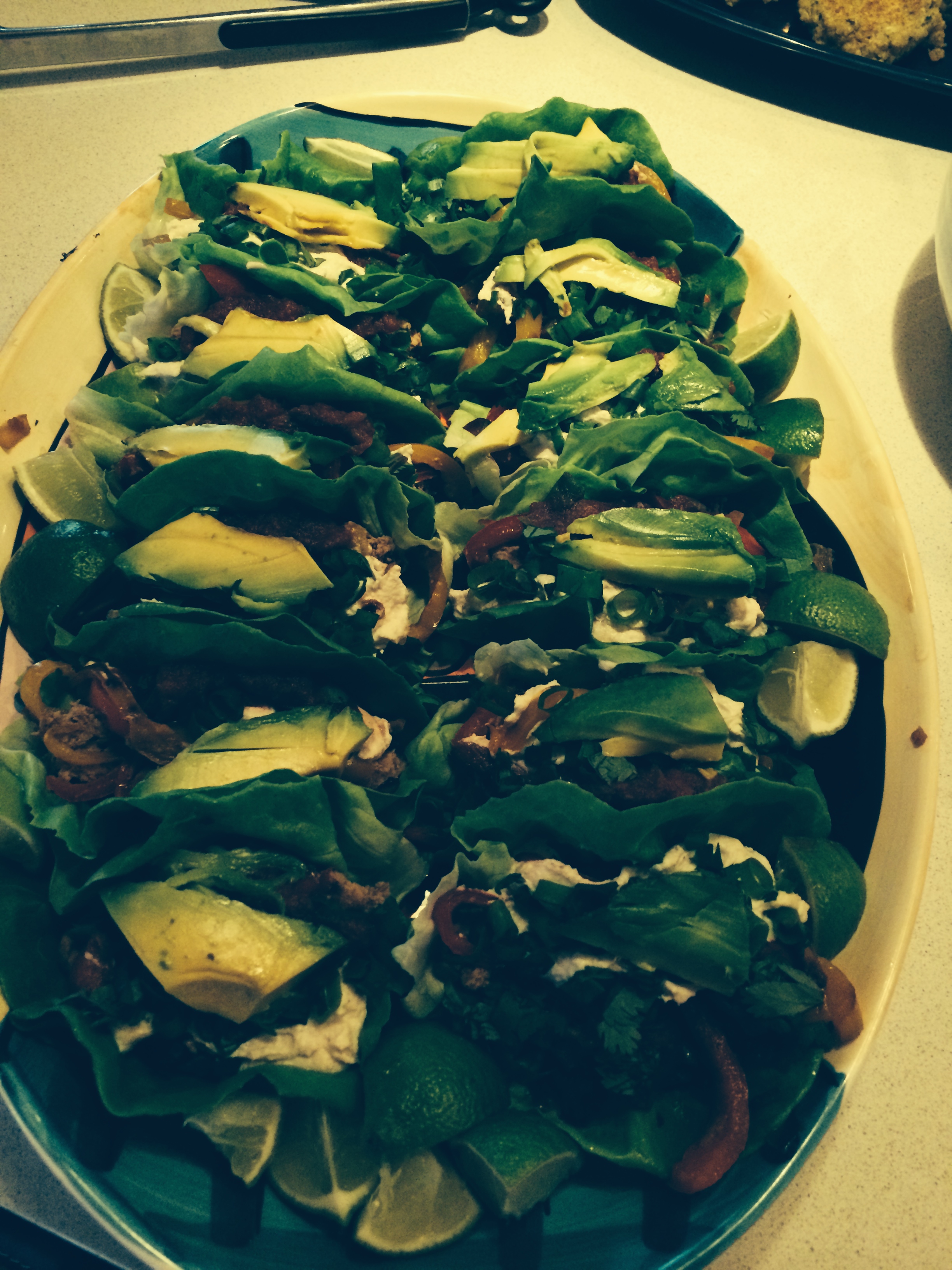 Assemble: Add a large lettuce leaf onto a plate, top with taco meat, sauteed peppers + onion, and the rest of your desired toppings.